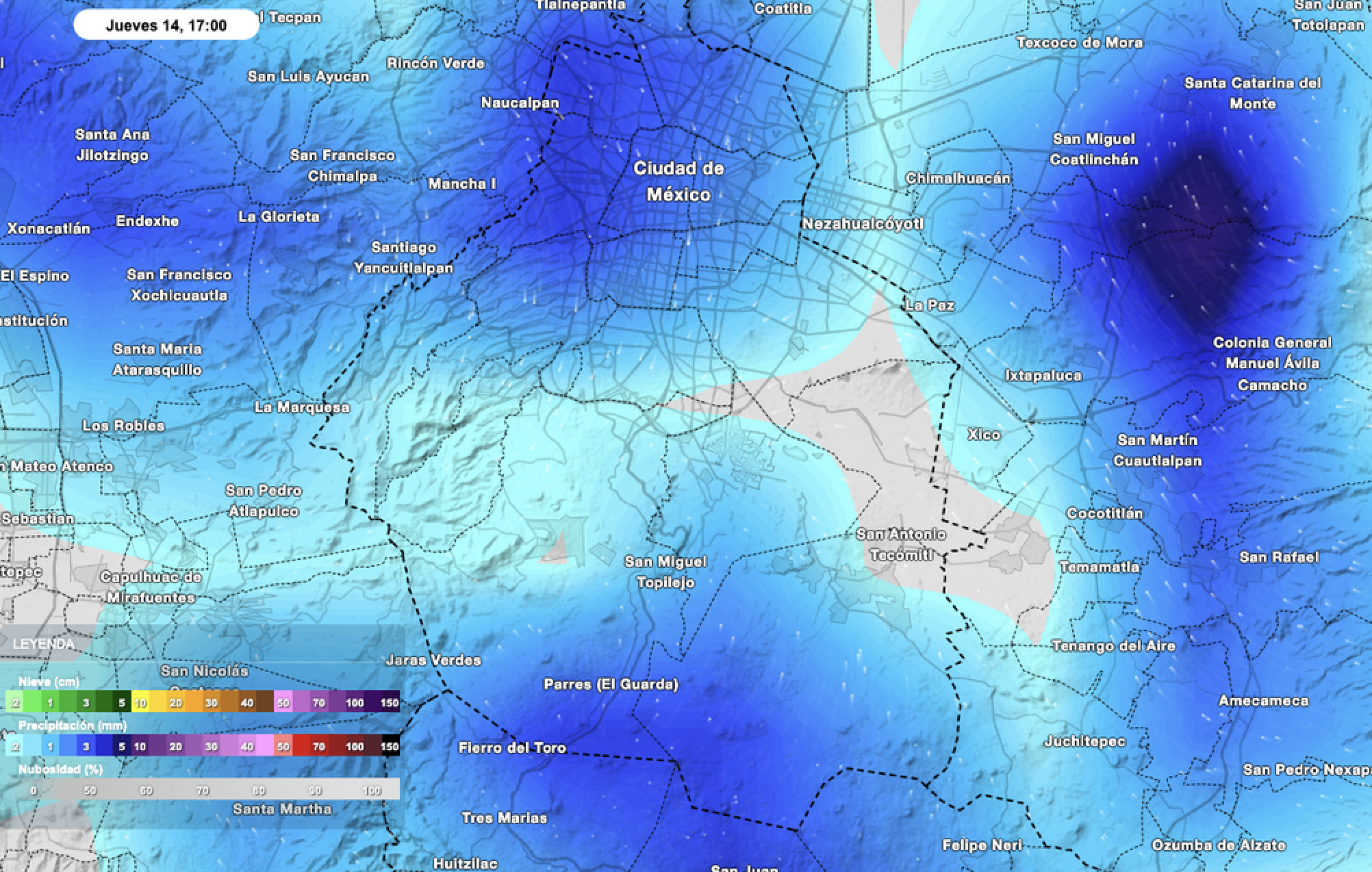 - Tarde (4 a 6 pm): Aguaceros fuertes con tormentas eléctricas y granizo, especialmente en Azcapotzalco, Miguel Hidalgo, Cuauhtémoc, Benito Juárez, Álvaro Obregón, Tlalpan y Milpa Alta. Acumulados de hasta 25 mm en el sur y norte. Temperatura máxima de 23 a 26 °C.