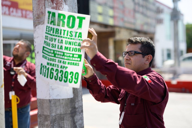 “Yo a la señora del tarot le digo que yo veo que tendrá problemas con el municipio de Escobedo, aquí está prohibido colocar anuncios en postes, estos anuncian afean nuestra ciudad, estos anuncios se caen y se convierten directamente en basura y terminan en nuestras alcantarillas provocando inundaciones”, “Vamos a hacer una revisión exhaustiva de todos los anuncios que hay en el municipio, está prohibido colocar publicidad en los postes, está prohibido obstaculizar el paso de las banquetas por eso vamos a culminar a las empresas a que quiten la publicidad, si no la quitan nosotros las quitaremos y procederemos a sancionarlos”, puntualizó el Alcalde.