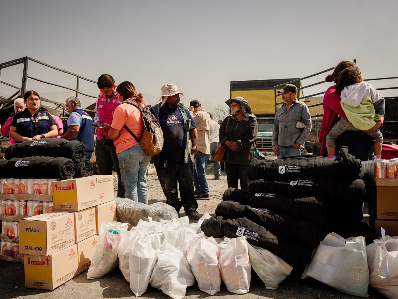 En la colonia El Obispo, cercana a la carretera Monterrey-García, se entregaron kits de hidratación, despensas, artículos de higiene, colchonetas, kits para menores de dos años y tinacos para almacenamiento de agua potable, con el objetivo de mitigar riesgos sanitarios.