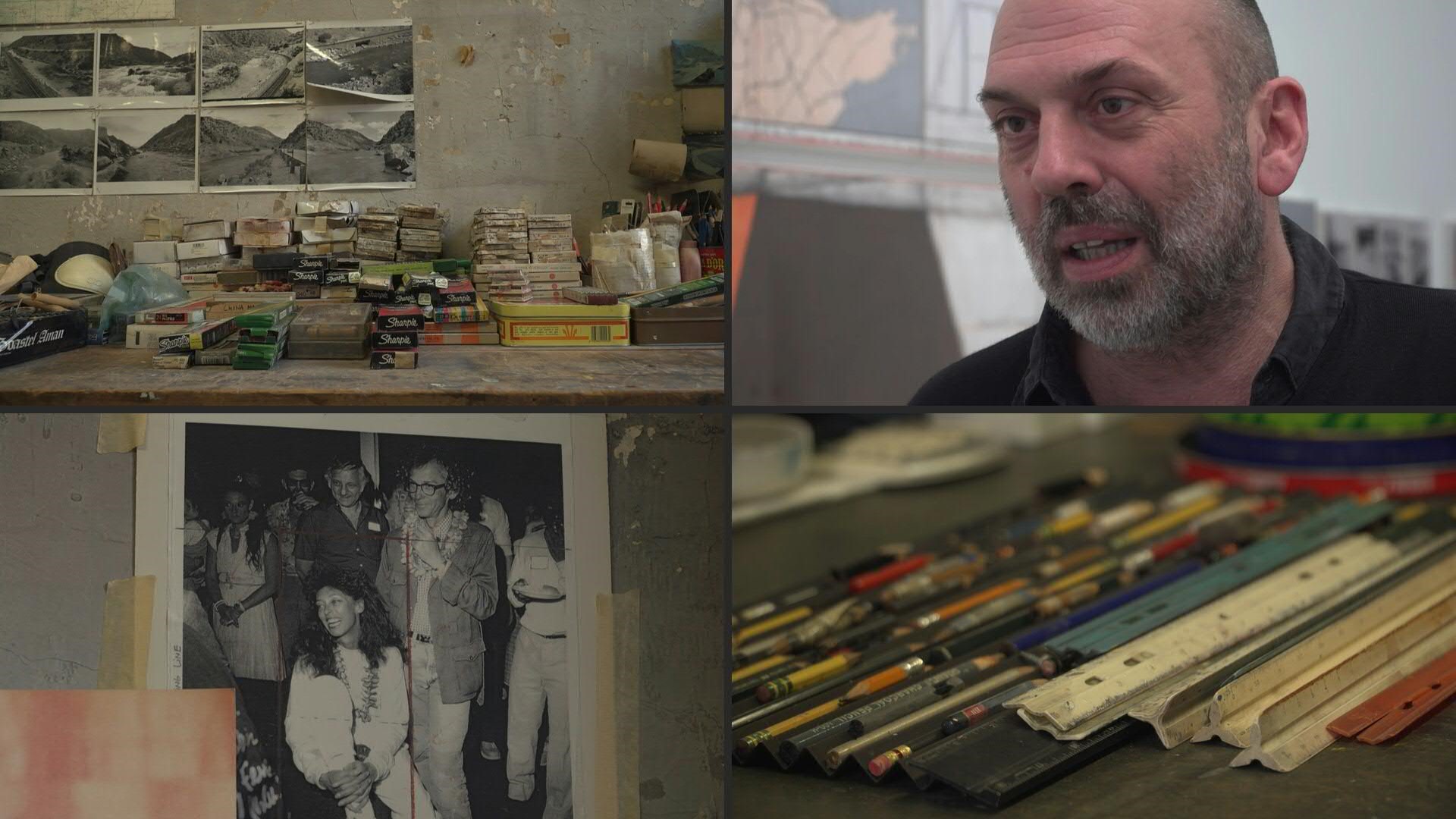 Bocetos del Arco de Triunfo de París y del proyecto Mastaba en el desierto de Abu Dabi se apilan en las mesas de trabajo y en las paredes, junto con pequeñas obras de paquetes envueltos atados con cuerdas.