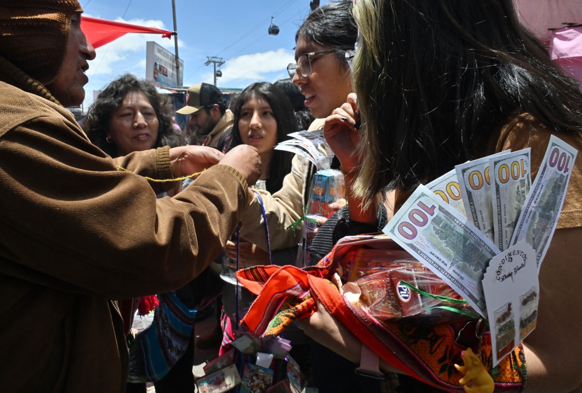 «¡Dólar, dólar, dólar!». El grito resuena en la Feria de la Alasita, el famoso mercado de miniaturas en La Paz, a la que acuden miles de bolivianos ansiosos de adquirir un talismán contra la sequía de dólares y combustible que padecen desde hace meses.