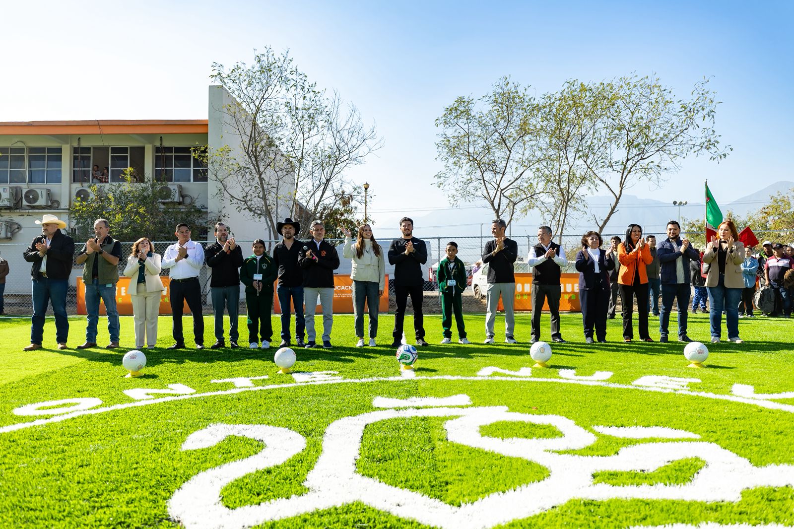 “Hoy aquí en la escuela de García vamos a estrenar la cancha 402 que llevamos construida de 500. Eso es niños estudiando, haciendo ejercicio, jugando fútbol. Vamos a estar muy al pendiente de seguir construyendo canchas en García”, expresó.