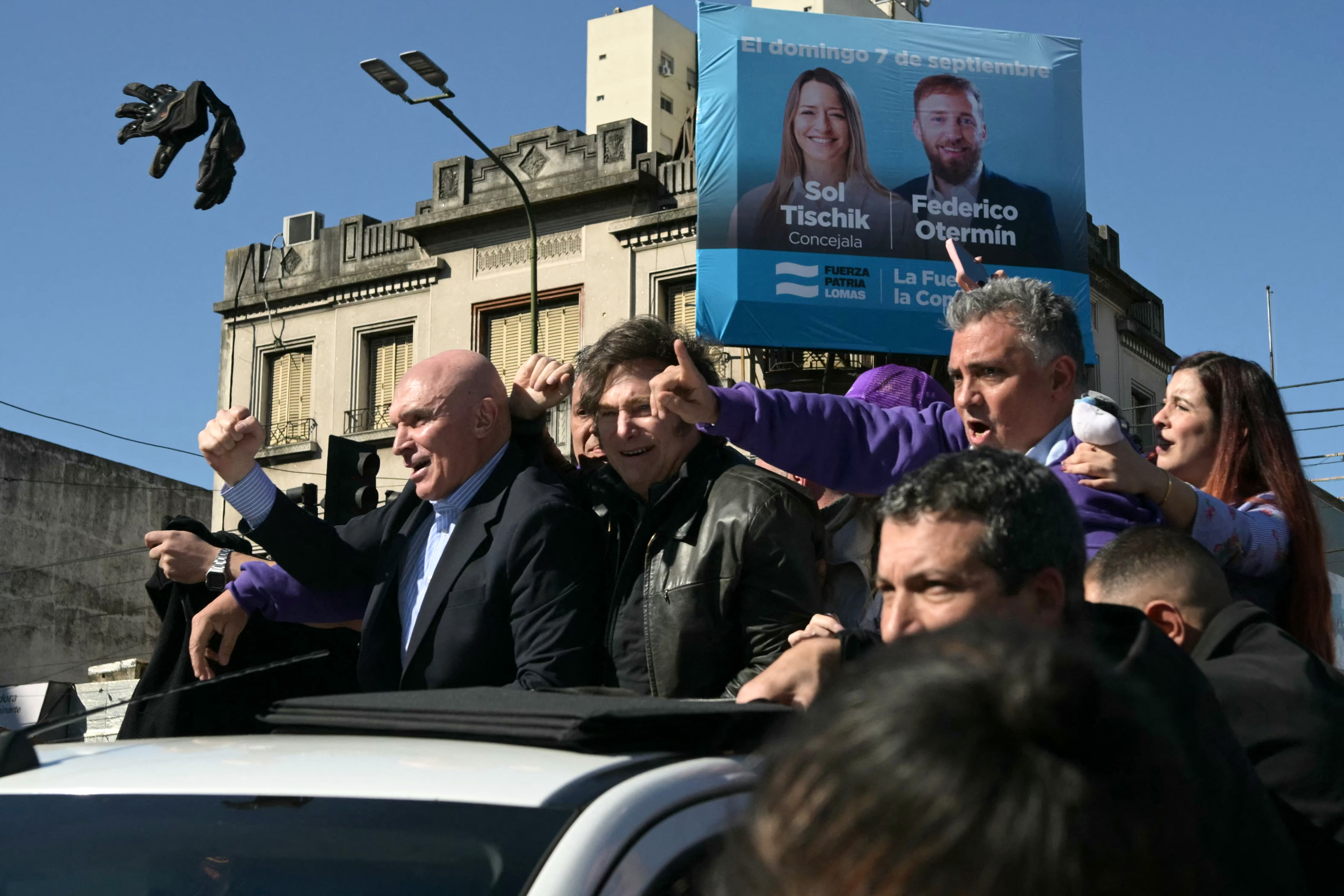 Milei circulaba en la caja de una camioneta y saludaba a sus seguidores durante una caravana de campaña en Lomas de Zamora, 20 km al sur de Buenos Aires, cuando manifestantes que se oponían a su presencia comenzaron a arrojar plantas de los canteros, piedras y botellas hacia el coche presidencial, constataron periodistas de AFP.