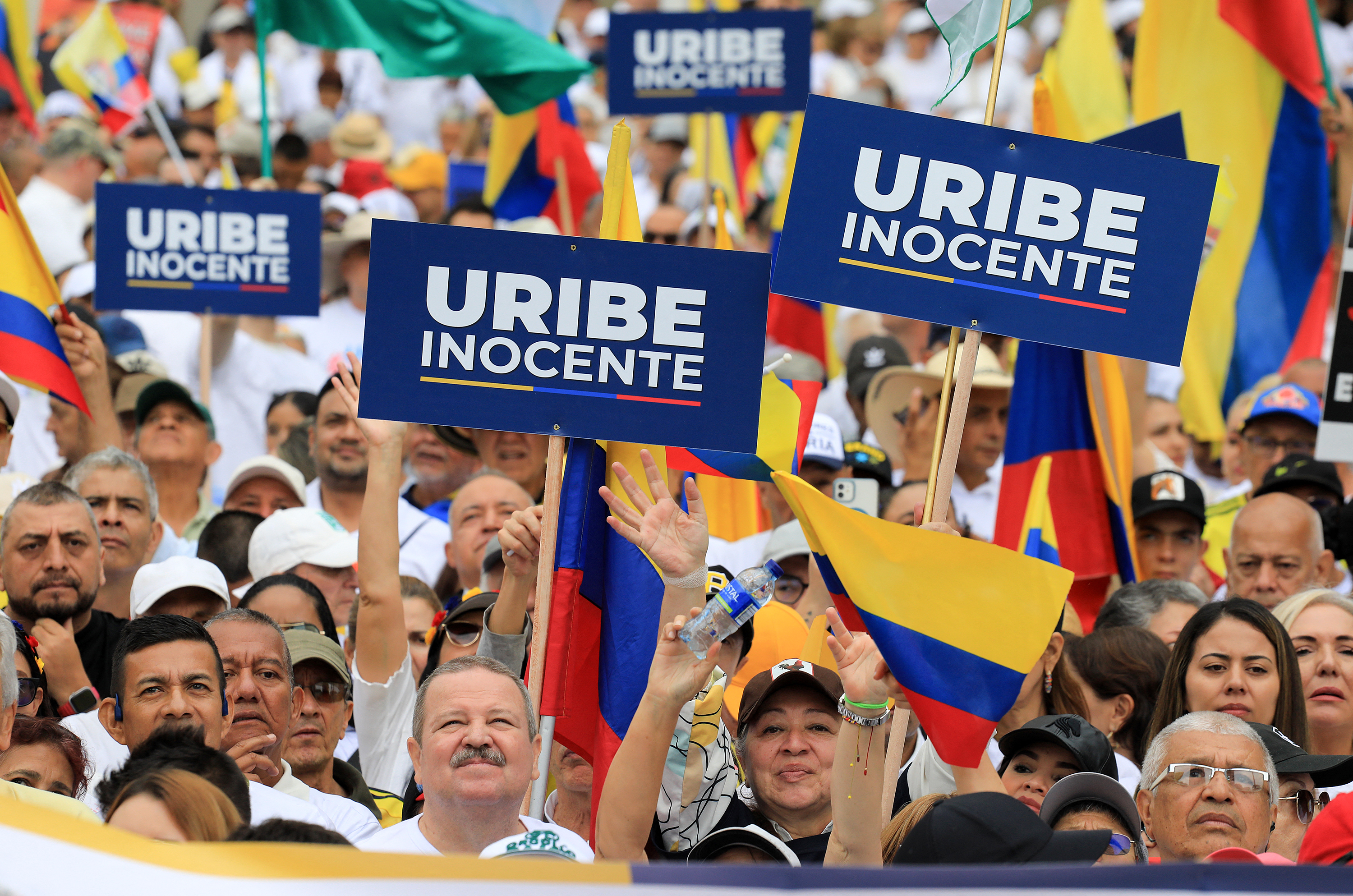 «Estamos aquí (…) para que el pueblo colombiano sepa la verdad, que este proceso fue manipulado por una jueza», dijo a la AFP Sergio Carreño, estudiante de derecho de 24 años enfundado con el sombrero estilo aguadeño (blanco) característico del expresidente.