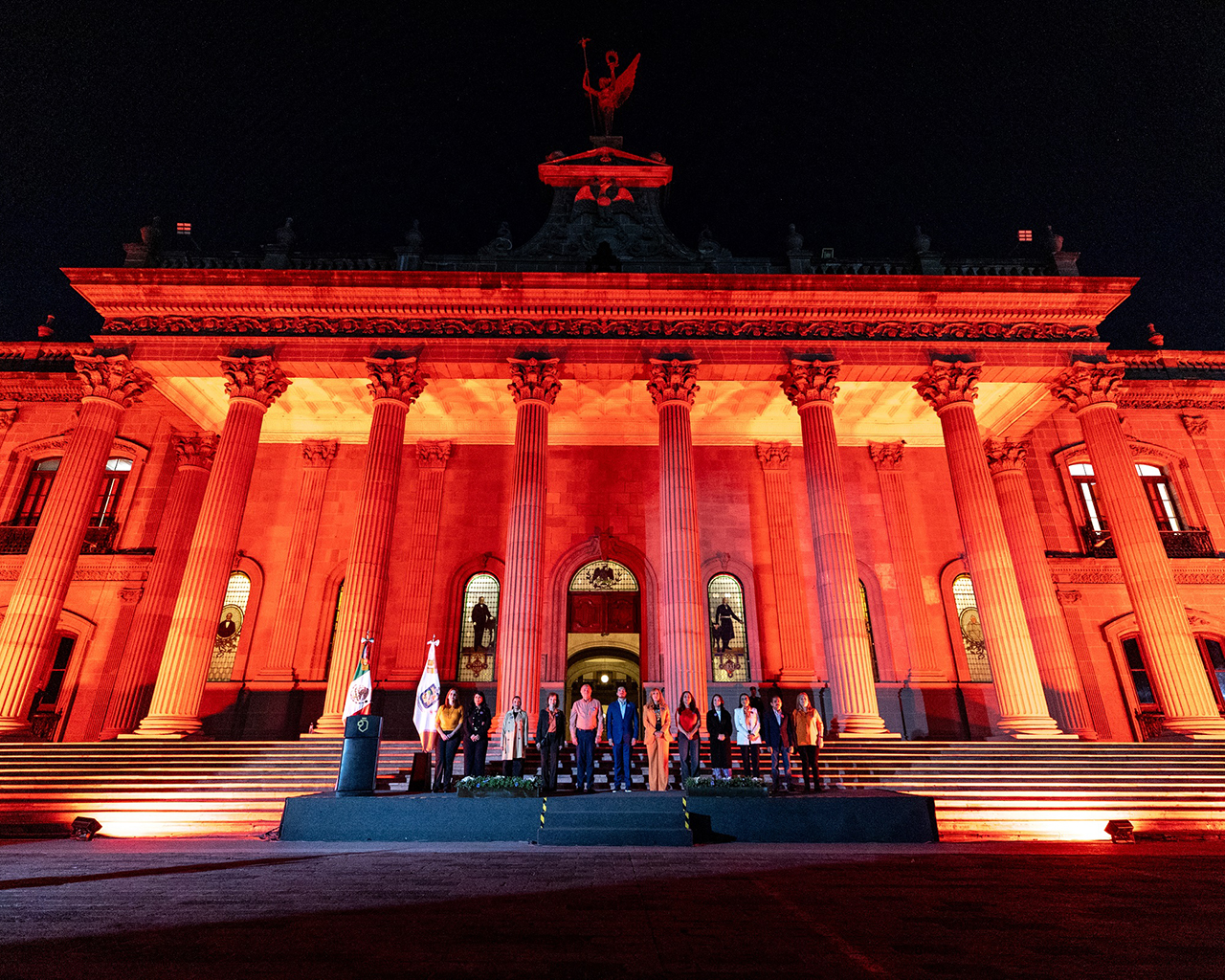 El Palacio de Gobierno de Nuevo León se iluminó en color naranja que representa un futuro optimista y libre de violencia contra las mujeres y niñas.