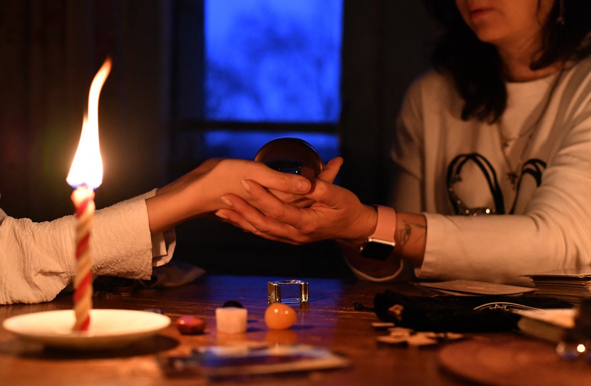 La mujer, con 15 años de experiencia, balancea un simple collar de perlas sobre algunas indicaciones garabateadas en un trozo de papel. Le hace preguntas al cliente y murmura algunas palabras.