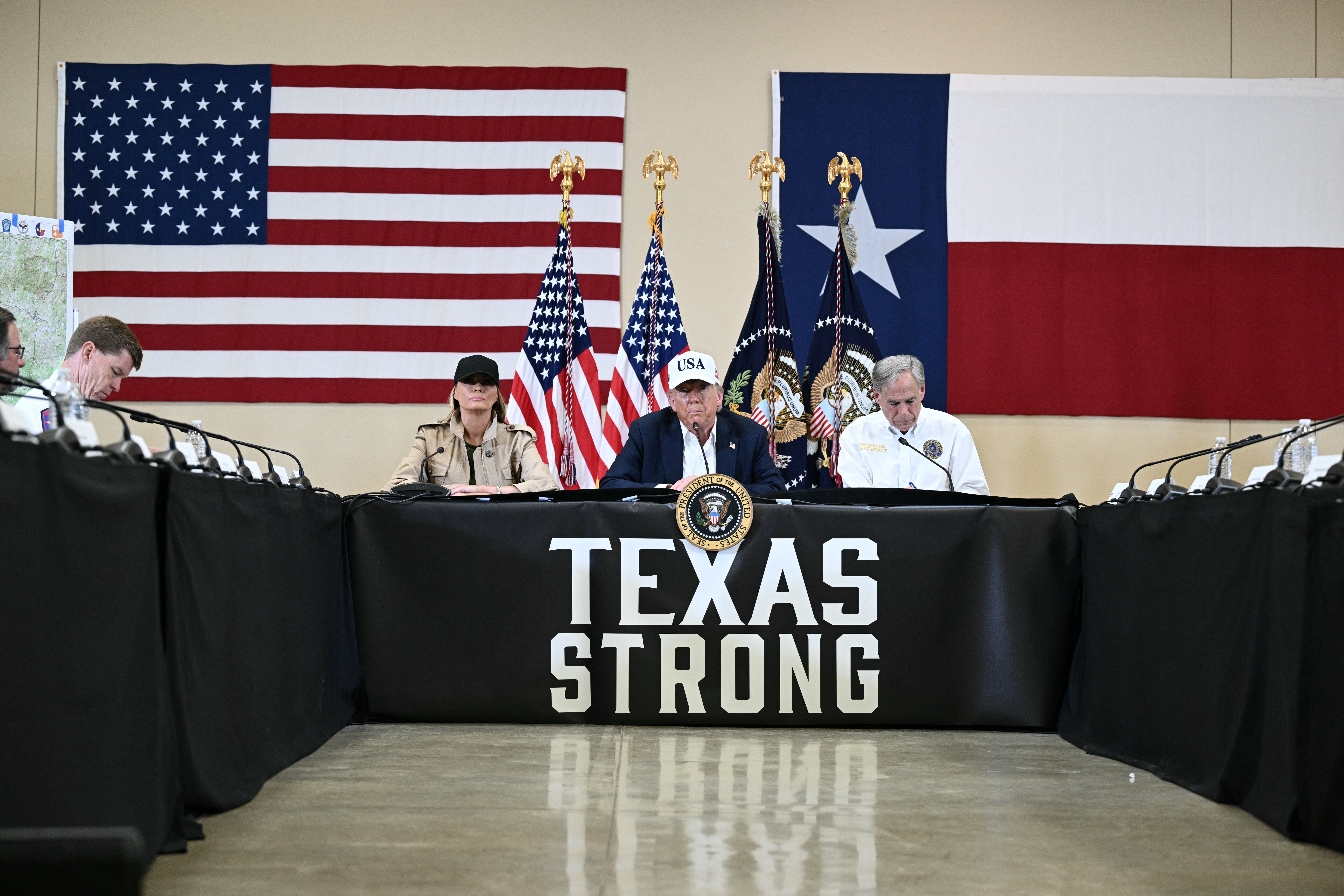 Acompañado de la primera dama Melania Trump, el republicano subió al Air Force One para reunirse con socorristas, familias y funcionarios locales una semana después de que inundaciones torrenciales dejaran al menos 120 muertos.